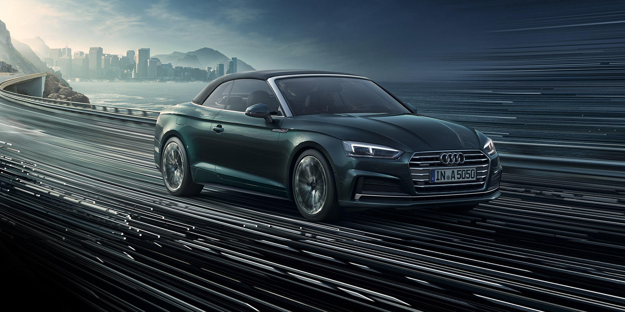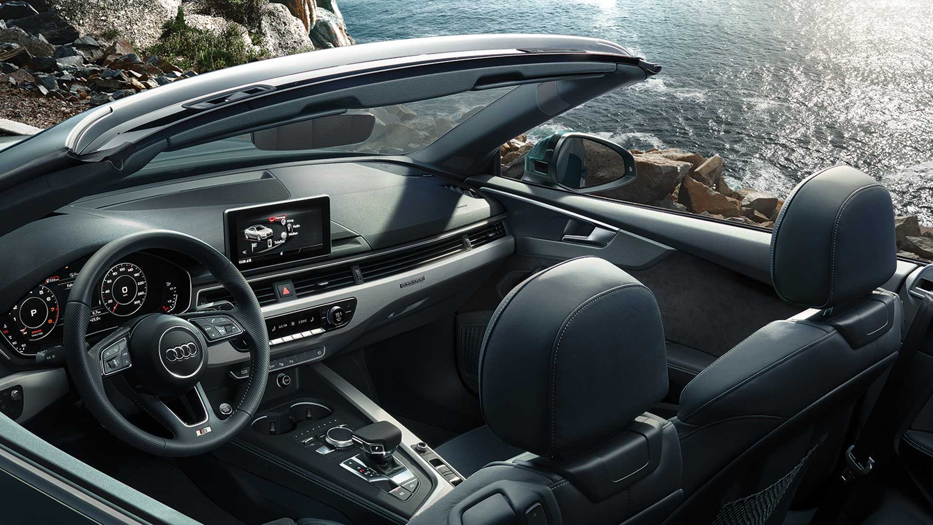 Sharp, prominent lines, an assertively low and wide Singleframe grille, and piercing LED headlights give the A5 Cabriolet an unmistakable presence. It looks just as good with the high-quality fabric roof folded up, or down.